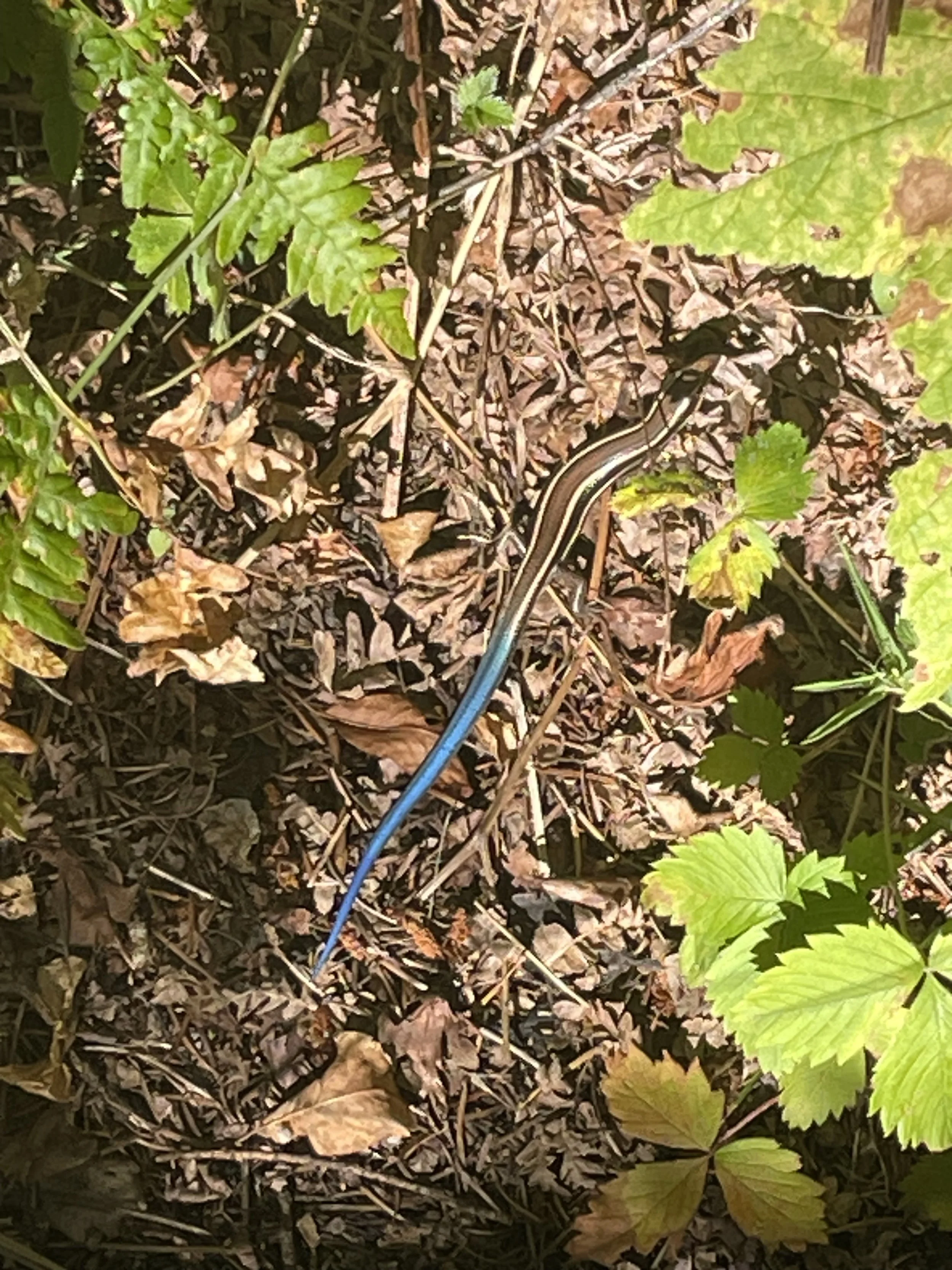 I started early on Sunday, hoping to finish the rest of the surveying along the Lochsa in time to meet up with the other crew by evening. Skookum creek trail (#204) was the first on the to-do list, and was overgrown but decent most of the way, bouncing from a dry south facing hillside infested with knapweed in and out of the lush cedar forest along the creek bottom before crossing the creek and heading up the hillside. It showed no sign of recent human use, though it was criss-crossed with elk trails and covered with ungulate tracks and quite a few piles of black bear scat. Trail conditions gradually began to deteriorate, and after disappearing briefly in a few fern-filled meadows, it faded out completely at around 5000 feet elevation. I then swung down for a brief visit to the Lochsa Historic Ranger Station on my way to finish up surveying trail 201, where I was generously offered as many wild plums growing on the trees as I wanted, as most of them were already rotting on the ground. This trail was in good condition, and even extended slightly past the end marked on the map, though it was unfortunately severely infested with St. Johnswort and Knapweed. I heard a black bear lumbering through the brush not far off the trail, perhaps on the way to get to work on the plums that I hadn’t gotten to, but was unfortunately unable to see it through the thick brush. I had left trail 142 for last, as it was just over two miles and I figured it would be a nice easy hike to end the day. This decision quickly reinforced a lesson I should already know about looking a little closer at topo lines before assuming anything about trails, even if they’re only two miles, because upon leaving the car at 4:00 I learned that the trail included over 2500 feet of vert on loose, gravelly soil. This was enough to just crack 13,000 feet of vert for the past two days of surveying, and I returned to the car exhausted, but was delighted to find several brilliant-blue skinks along the way. I then drove into Kooskia, got gas, and called Chris to finalize plans for meeting up with the other crew since we had been struggling to plan over satellite. Chris told me that Kalle had gotten a flat tire so her and Micah were out of the field, so we planned on picking them up the next morning to drop them at Clearwater Crossing to handpull knapweed. Thoroughly ready to fall asleep before waking up at 5:00 the next morning to pick them up, I got a burger to-go at the only open restaurant in Kooskia, drove back up the Lochsa to the nearest passable campsite, and passed out.