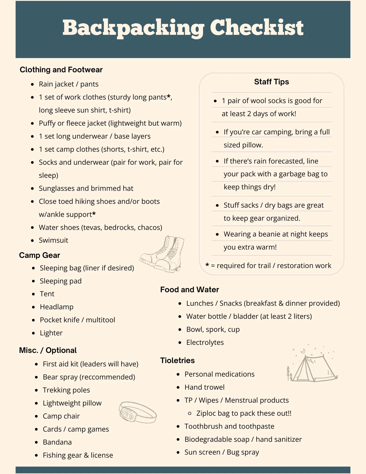This checklist is meant to be a general guide, not comprehensive list. Everyone packs differently, and you know yourself best! If you run cold, throw a beanie or a pair of gloves in your pack. If you sweat a lot, you might want to change your socks more frequently than the person next to you. If you’re going out for 1 night vs 5, you’ll need more things!
